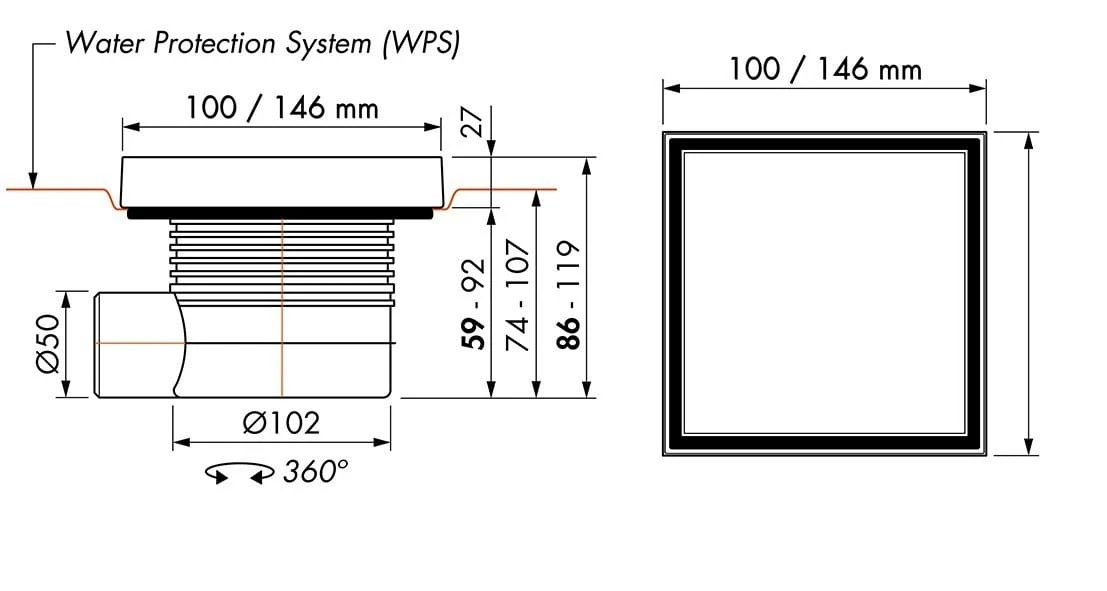 - Siphongehäuse und Abdeckung sind in der Höhe verstellbar