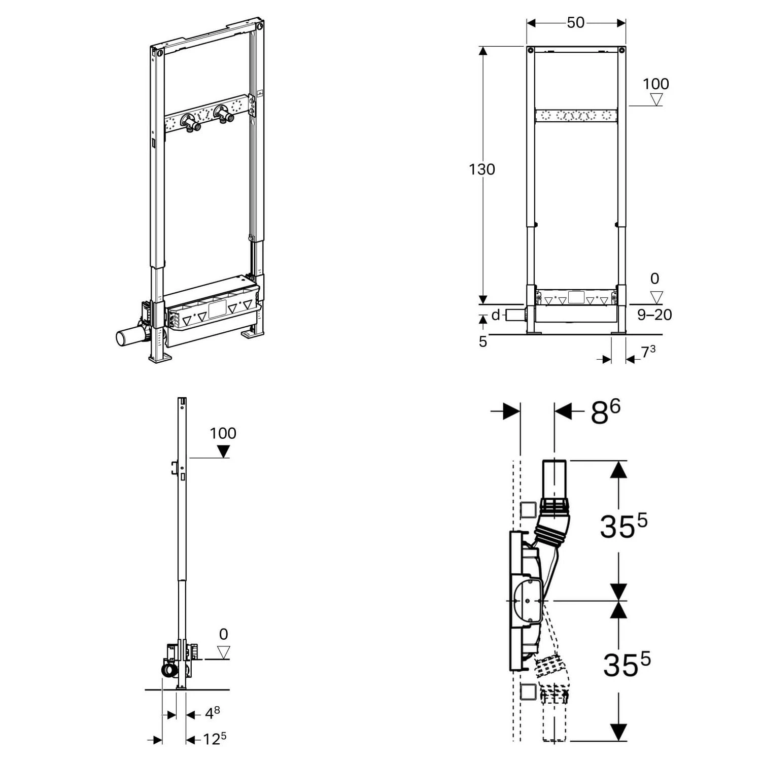 Geberit Duofix Element für Dusche 130 cm mit Wandablauf, Wandarmatur AP d50
