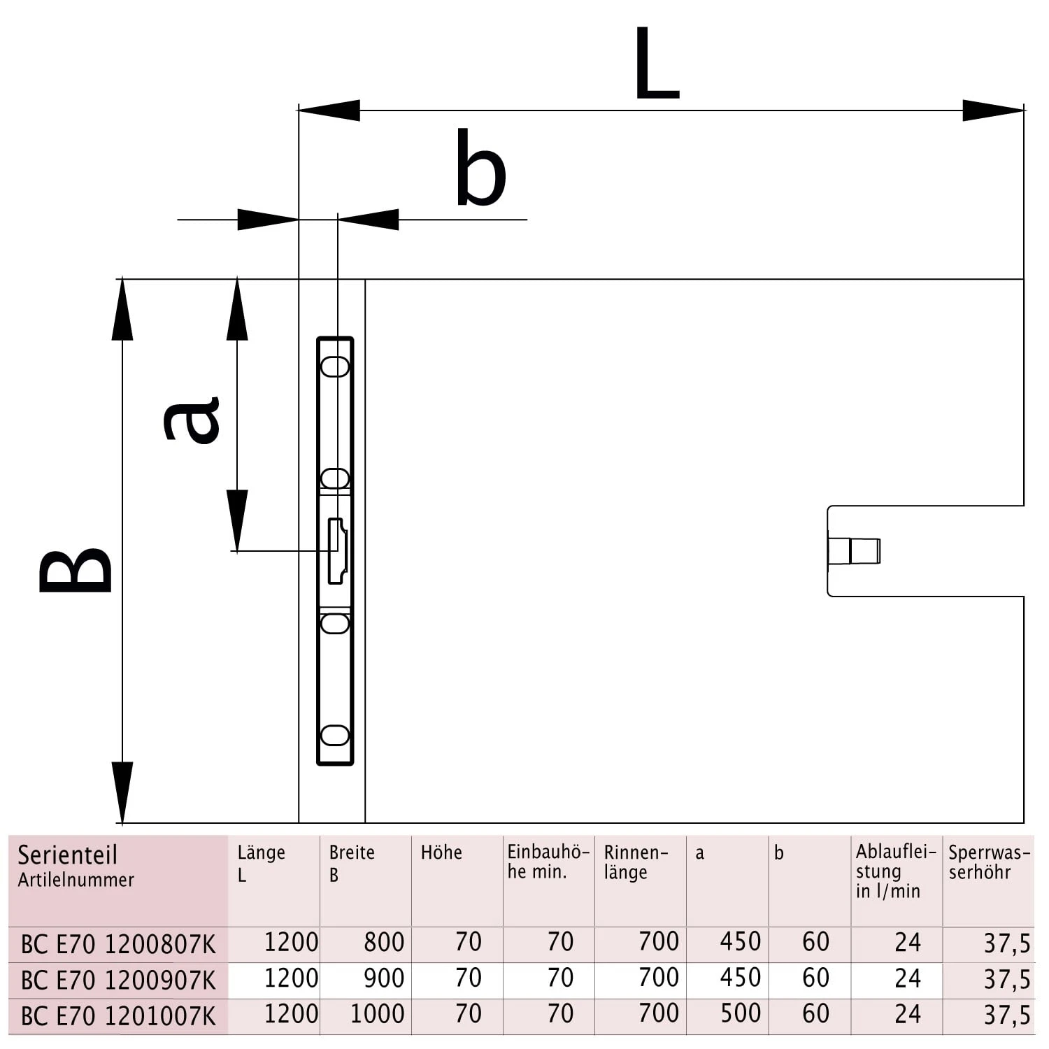 - Serienmäßig mit Rinnenabdeckung aus Edelstahl in Rinnenlänge 70 cm und Dichtecke 100 x 45 cm