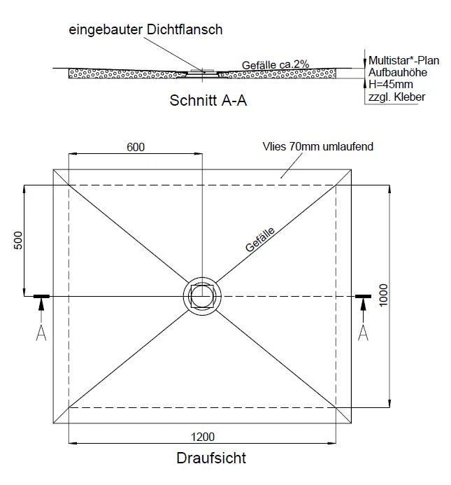 Schedel Plan Duschelement Bodeneben 120 X 100 Cm, Verfliesbar, Ablauf Mittig