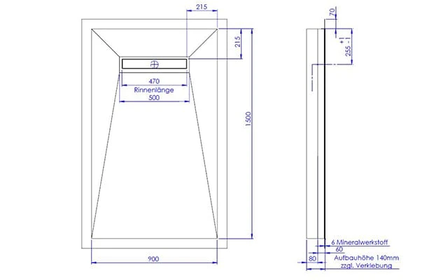 Schedel Plan Plus Mineral-Duschelement bodeneben 90 x 150 cm mit Rinne, Gefälle vierseitig